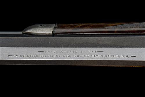 for 1889 (number partially defaced and re-applied), with blued octagonal 26in. barrel signed by the maker, dove-tailed blade fore-sight, elevating buckhorn rear-sight, slab-sided action, the colour hardening faded to silver, blued bolt, the top-tang fitted with a period folding adjustable peep-sight marked 'PAT JAN 29/79', highly figured chequered pistol-grip butt-stock of approximately 3x quality with crescent heel-plate, single set trigger, chequered matching walnut fore-end and full-length magazine-tube, strong amount of original finish remaining