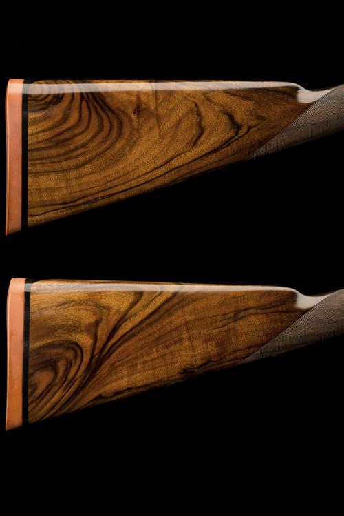 30in. nitro barrels, the ribs engraved 'WESTLEY RICHARDS. 178, NEW BOND STR. LONDON. GUN MAKERS BY SPECIAL APPOINTMENT TO HIS MAJESTY KING EDWARD VII' and gold-inlaid '1' and '2' at the breech-ends, 2 1/2in. chambers, bored approx. imp. cyl. and 3/4 choke, wall thicknesses circa 20, some pitting, scroll-back treble-grip actions incorporating J. Deeley and L.B. Taylor patent hand-detachable locks, patent no. 17731 of 28th July 1897, use numbers 1083 / 4, A.E. Lard patent single selective triggers, patent no. 3952 of February 2nd 1899, use numbers 794 / 5, the toplevers engraved 'Westley Richards Patent One Trigger' and gold-inlaid '1' and '2', automatic safeties with gold-inlaid 'SAFE' details, detachable floorplates, barrel selector switches with gold-inlaid 'R' and 'L' details, fine acanthus scroll engraving surrounding the maker's name within a cartouche, the triggerguards engraved with a pointer and a hare, brushed bright and reblued finish overall, 14 1/4in. figured stocks including 3/4in. rubber recoil pads, fore-ends with Deeley & Edge patent release catches and horn finials, weight 6lb. 10oz., in their brass-cornered oak and leather case