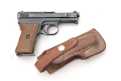 A 6.35mm (.25ACP) SEMI-AUTOMATIC POCKET-PISTOL SIGNED MAUSER, MODEL '1910/14', serial no. 204473, with exposed 3in. barrel, blued slide, blued frame and chequered walnut wrap-round grip, finish worn, complete with a later leather belt holster