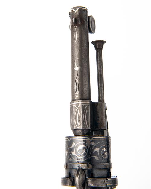 Continental, circa 1870, with octagonal to round 3 3/8in. barrel, the muzzle inlet with silver bands and drum mount for the folding flambeau bayonet stored to the left hand side, the barrel throat and top of barrel inlet with silver arabesques, dove-tailed fore-sight, open iron frame of Lefaucheux pattern inlet with silver scrolls and arabesques, the patterns and borders repeated on the plain blued cylinder with external ratchet locking, spurred hammer, folding trigger and smooth ivory bag-shaped grips