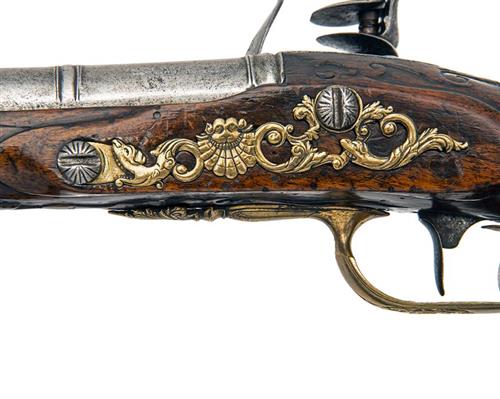 Dutch or German circa 1750, with round triple-stage 10 3/4in. iron barrel, moulded bands at each intersection, solid top-tang, the breech with sighting groove (possibly added later), slightly curved radiused lock with moulded border and engraving to the pointed tail, carved pan, bridle-less frizzen with signature below the spring, carved walnut full-stock with moulded borders along the fore-end edges, ramrod channel and around the lock, rococo carved apron around the top-tang, large teardrops, chisel engraved brass furniture including bulbous pommel with a central Romanesque bust and long side-spurs, square-backed trigger-guard, carved escutcheon with a quartered crowned coat of arms to the wrist, complex pierced side-plate and turned thimbles, further carving to the fore-end around the ramrod throat and ivory tipped ramrod (butt cracked through in antiquity and repaired)