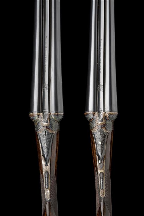 28in. replacement nitro barrels (in 1964, barrel numbers 19240 / 1), ribs engraved 'WESTLEY RICHARDS & CO., LONDON.' and gold-inlaid '1' and '2' at the breech ends, 2 3/4in. chambers, bored approx. 1/4 and 1/2 choke, scroll-back treble-grip actions incorporating J. Deeley and L.B. Taylor patent hand-detachable locks, patent no. 17731 of 28th July 1897 with improved 'lighter pull-off' modification, patent no. 10567 of 7th May 1907, use numbers 2316 and 2302, toplevers engraved 'WESTLEY RICHARDS EJECTOR' and gold-inlaid '1' and '2', manual safeties with gold-inlaid 'SAFE' details, detachable locks with engine turned finish, hinged floorplates, profusely engraved with bold acanthus scrollwork, the triggerguards with game scenes of a pointer (No.1) and a covey of partridge (No.2), retaining virtually full renewed colour-hardening and finish, 14 5/8in. well-figured stocks with blued and engraved steel heel and toe plates, fore-ends with Deeley and Edge patent release catches gold-inlaid '1' and '2' and with horn finials, weight 6lb. 8oz., in a brass-cornered oak and leather case
