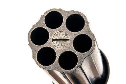 circa 1845, with 3 1/2in. six-shot barrel cluster carved with false ribs, London proofs, integral nipple-shield with cut-out for capping, border and scroll engraved radiused boxlock action with engraved bar-hammer, guarded trigger, signed top-tang, finely chequered walnut grip with slightly swollen pommel, engraved iron pommel-cap with central trap for caps, slight traces of finish