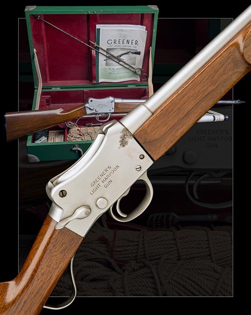 take-down nickel finish example, proofed for .38 Special Blank, 14.5GRs No.5 Cordite, 16 oz. harpoon, manual safety lever, action engraved 'W. W. GREENER. MAKER. BIRMINGHAM. ENGLAND.' and 'GREENER'S LIGHT HARPOON GUN.', in its wood case with lines, guides and harpoons, cleaning kit, labels and a reprint of 'The Greener Light Model Harpoon Gun' sales brochure, together with an additional harpoon and line guide