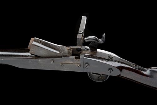 Belgian manufacture circa 1875, with tapering iron 47in. barrel, small dove-tailed fore-sight (missing bead), flush-fitting rebated breech-block with internal chamber hinging upwards from the front with rear hinge and nipple, an articulated locking lever securing it into battery and folding alongside the left hand side of stock, back action lock modified from a military lock-plate (remnants of a partial French arsenal signature), substantial iron top-tang, walnut butt-stock of oversized military form, moulded and shaped iron action body with integral tapering fore-end and rectangular aperture to the underside possibly for a mount, a further rebated section to the barrel just forwards of the fore-end, also believed for a swivel mount