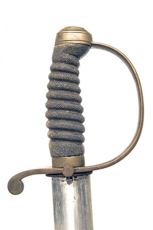 circa 1845, with polished straight 23in. spear-point double edged blade, the right hand face etched 'BERKSHIRE CONSTABULARY' around a Queens Crown, plain brass 'D' shaped knuckle-bow marked '3' with locking catch for scabbard and turned down quillion, sharkskin covered grip (wire binding absent) and stepped pommel, complete with its brass-mounted leather scabbard stamped 'S5' and leather frog marked on the reverse 'B.C. 34'