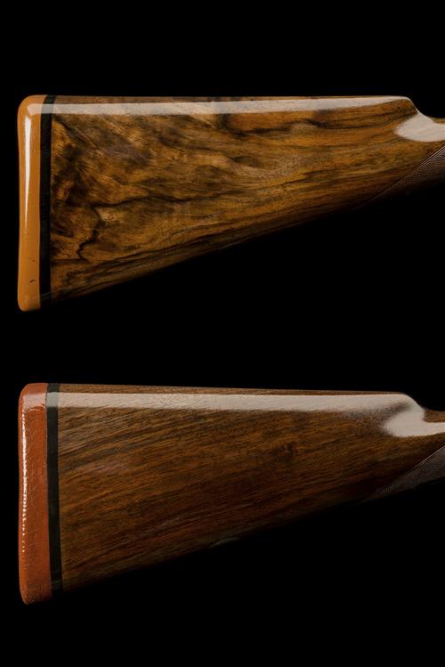 28in. nitro reproved barrels, ribs gold-inlaid '1' and '2', tubes engraved 'E.J. CHURCHILL (GUNMAKERS) LTD. 8 AGAR STREET. STRAND. LONDON. W.C.2.', 2 1/2in. chambers, bored approx. 1/4 and 3/4 choke, No.1 left wall at 19-, treble-grip actions, toplevers gold-inlaid '1' and '2', automatic safeties with gold-inlaid 'SAFE' details, non-selective single triggers, best floral bouquet and acanthus scroll engraving, the undersides with ovals inscribed 'UTILITY MODEL', retaining traces of original colour-hardening and renewed finish, 14 1/2in. stocks including 3/4in. rubber recoil pads, weight 6lb. 7oz., in their lightweight leather motor case