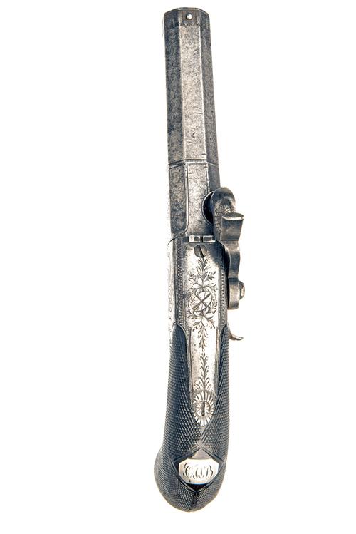 circa 1835, with octagonal turn-off 2 3/8in. barrel, engraved band at muzzle, small fore-sight bead, engraved borders at the join, scroll engraved squared boxlock action with radiused corners signed in a borderline engraved panel on the left hand side 'CLABROUGH, LINCOLN', notch rear-sight to the trophy engraved top-tang, engraved dolphin-headed side-hammer with sliding safe behind, finely chequered walnut bag-shaped butt fitted with a white metal lion-mask butt-cap, initialled clipped-corner rectangular escutcheon to wrist and flush-fitting folding automatic trigger