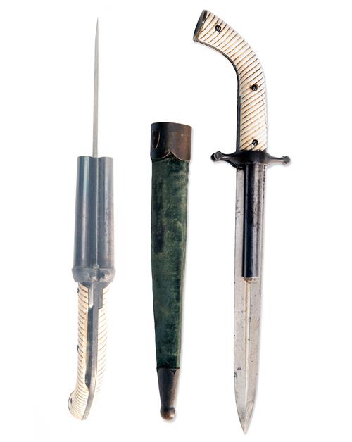 Belgian or French circa 1850, with straight tapering double-edged 9in. blade, both sides with deep central full-length fullers, the 'cross-guard' mounted with plain tapering 4in. barrels mounted along the fullers, one side of the cross-guard forming the hammers, the opposite fixed, concealed single trigger firing the barrels in sequence, moulded ribbed ivory pistol-grip butt (one with loss to back edge and one mainspring at fault), full length iron grip-straps and nickel circular pommel-cap, complete with its moulded green velvet scabbard with brass chape and throat mounts
