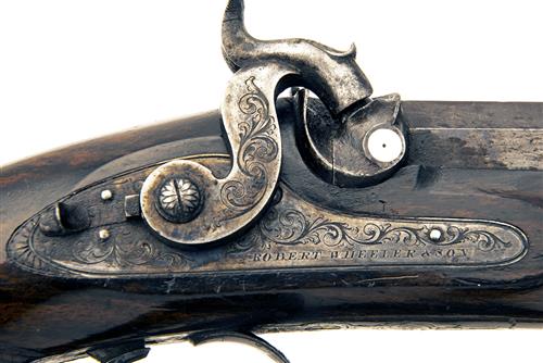 circa 1845, with browned twist-iron octagonal 10in. barrels signed on the top-flats 'ROBERT WHEELER & SON', white metal dove-tailed fore-sights, standing notch rear-sights, colour hardened scroll engraved breech blocks with carved and fenced snails and vented platinum plugs, scroll engraved top-tangs, isolated borderline and scroll engraved dipped tail bar-action locks signed 'ROBERT WHEELER & SON', sliding safes behind the scroll engraved and moulded headed hammers, walnut half-stocks with flat-top chequered bag-shaped butts, oval escutcheons to the wrists, blued trigger-guard bows and tangs, set triggers and original ebony ramrods, much original finish remaining to both pistols (one pistol with some damage to chequered portion of grip)
