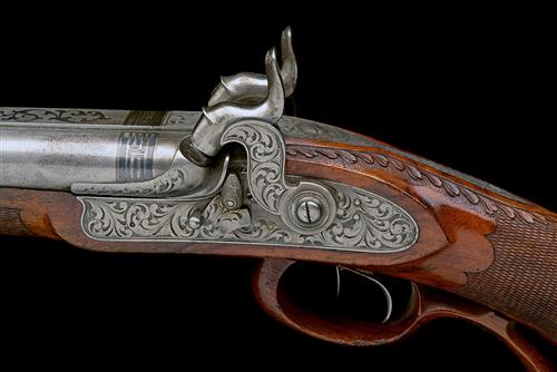 circa 1840, with brushed bright Liege proved 30 1/2in. barrels, the broad flat top-rib inlaid with white-metal scrolls for the first two fifths around a bordered panel signed 'RIEGER IN MUNCHEN', further inlaid bands and Greek key designs at breech, scroll engraved long top-tang, scroll engraved bar-action locks with swinging safes and carved and engraved hammers, figured walnut half-stock with complex bordered chequered panels to the fore-end and wrist, raised carved acanthus borders around the top-tang and a carved panel of acanthus foliage behind the raised moulded cheek-piece, smooth wood butt-end with iron heel-cap, carved walnut trigger-guard bow with white-metal screw escutcheons and horn-tipped wood ramrod