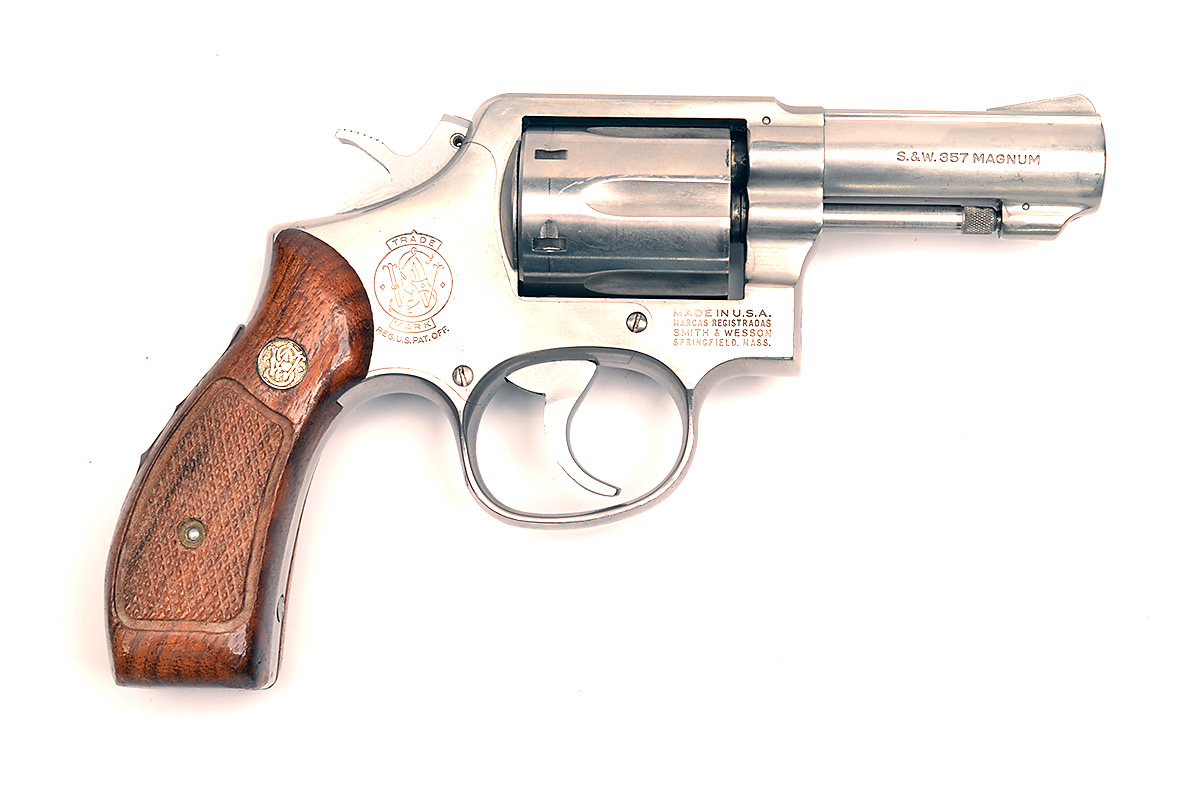 SMITH & WESSON .357 MAG. MODEL '65-2' STAINLESS-STEEL DOUBLE-ACTION SIX-SHOT REVOLVER, serial no. 7D49903, 3in. bull-barrel, fixed sights, swing-out fluted cylinder, solid frame, marked 'HAMMERLI', chequered wooden grips, the backstrap marked 'MASS. STATE POLICE.'