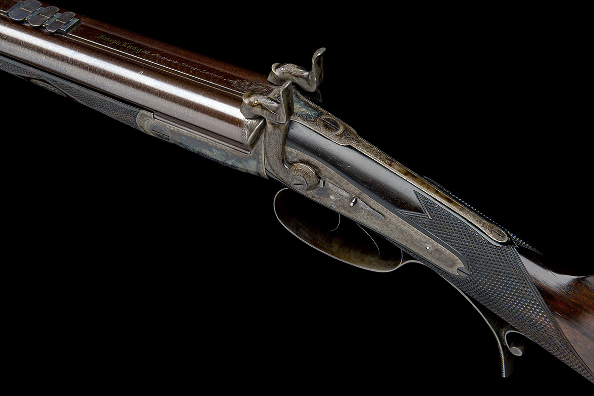 circa 1860, with rebrowned damascus 26in. side-by-side barrels, raised flat top-rib matted for the last 13 1/2in. and signed 'JOSEPH LANG' in gilt script and '22 COCKSPUR STREET, LONDON', detachable bead fore-sight, rear-sight with three flush-folding leaves, each with gold centreline, border and scroll engraving at breech, narrow standing breech with shallow carved percussion fences, borderline and scroll engraved elongated top-tang, borderline and scroll engraved back-action locks with sliding safes behind the dolphin headed engraved hammers, each with the eyes picked out in gold, the locks signed 'JOSEPH LANG' in crescent panels, figured walnut butt-stock chequered at the wrist, raised cheek-piece, engraved iron furniture including finely chequered pistol-grip spur to the lower tang, single bite forward-facing swing-lever opening, fully chequered walnut splinter fore-end with cross-key fixing and complete with a period walnut storage case refitted for this rifle and lined in burgundy baize with replacement trade label to inside of lid and containing a take-down cleaning rod and square nickel oil-bottle, the gun fully renovated and refinished to a high standard throughout