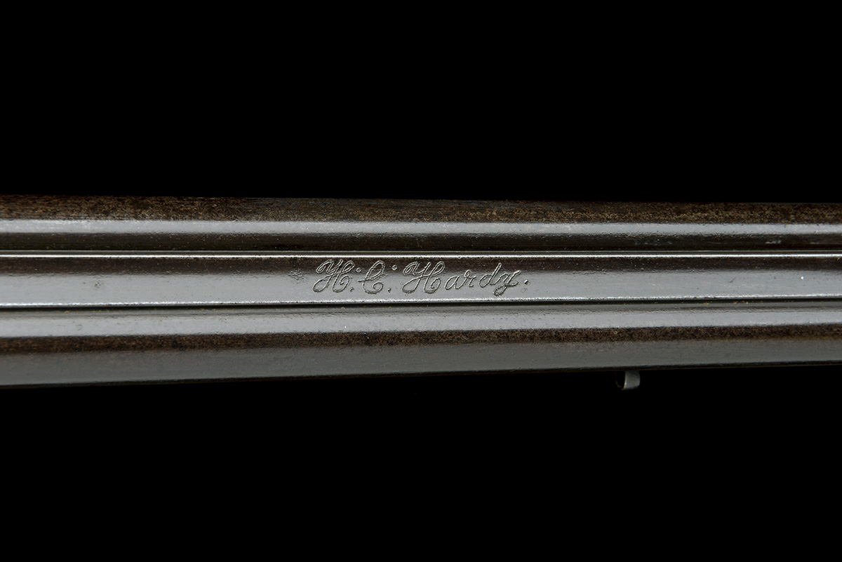 Belgian circa 1850, with 29 1/4in. barrels, the top-rib with later signature 'H. L. HARDY', bead fore-sight, moulded breech-blocks, engraved top-tang with shallow sighting groove, border and scroll engraved back-action locks, the right signed around the base of the hammer 'AGLON', the left 'SAARN', walnut half-stock, the chequered panel at wrist overlaid with a relief carved head of a stag, raised cheek-piece with a carved panel behind featuring a hunting dog in a woodland setting, moulded horn trigger-guard bow and lower tang, plain fore-end with complex barrel key escutcheons and brass tipped wood ramrod