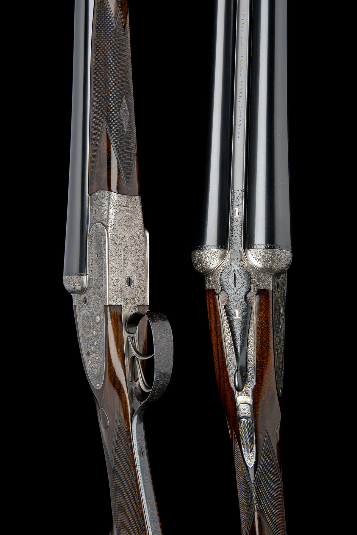 28in. nitro reproved barrels, ribs engraved 'W.C. CARSWELL. 4 CHAPEL STREET. LIVERPOOL.', and gold-inlaid '1' and '2' at the breech ends, 2 3/4in. chambers, bored approx. imp. cyl. and 3/4 choke, treble-grip actions, toplevers gold-inlaid '1' and '2', automatic safeties with gold-inlaid 'SAFE' details, fine acanthus scroll engraving with floral bouquets, bright and blued finish overall, 14 5/8in. well-figured stocks including 3/4in. leather covered recoil pads, weight 6lb. 10oz, in their brass-cornered leather case