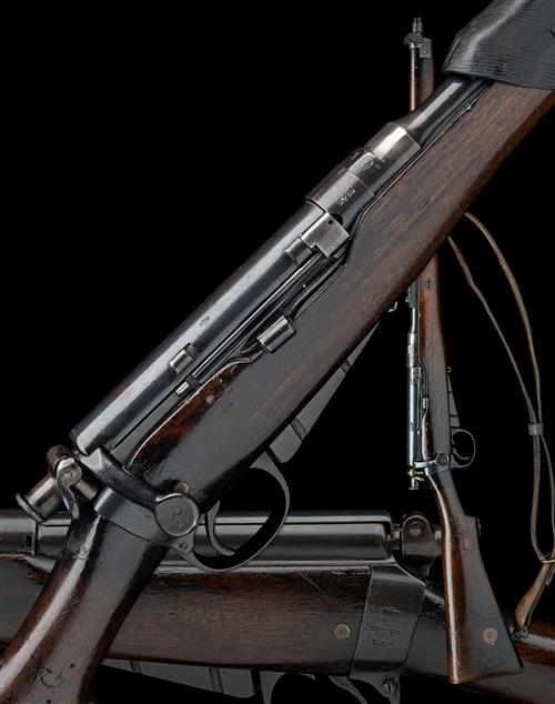 dated for 1896, with nitro proved (2007) 21in. barrel, muzzle-cap with built-in fore-sight protector, elevating adjustable rear-sight, 'Lee-Metford' style bolt with dust-cover and turned-down handle with flat knob, magazine cut-off, wrist of action stamped 'ENFIELD 1896 LEC 1' together with a crown over 'VR', walnut full-stock, the butt with brass heel-plate, trap-door for oil-bottle and pull-through (missing), the side of butt with vacant brass disc, the wood stamped 'R.M. ENFIELD' in a circle around 'W.D.' and a broad arrow over 'I', the wrist with an armourer patch repair to right hand side and amateur initials 'G.H.G.', the fore-stock with three-quarter length walnut barrel cover and short six-round magazine attached to the rifle via a security link, the whole with a strong amount finish and complete with a period correct pattern leather sling and rear-sight cover, missing clearing rod