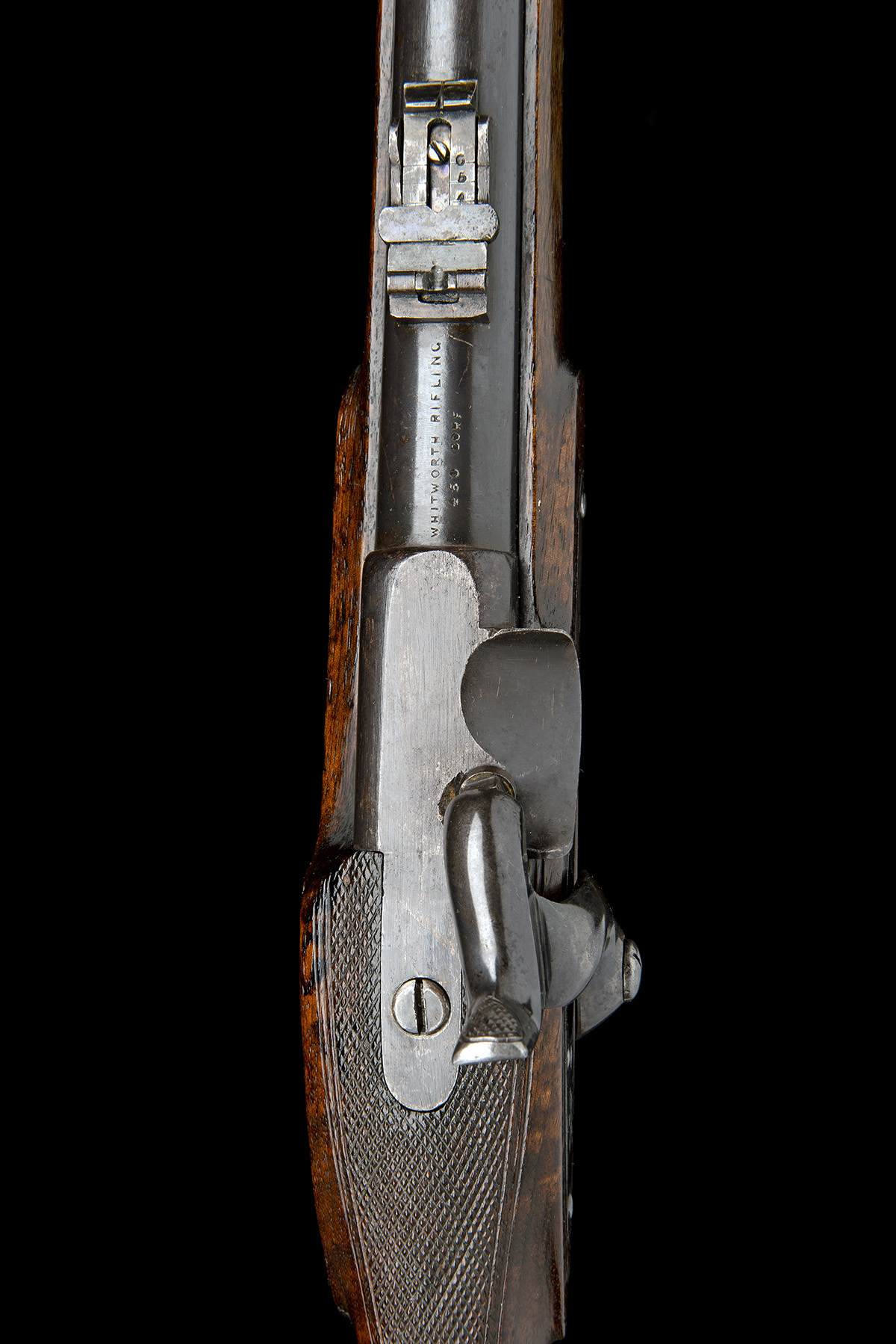 circa 1865, with 26in. barrel marked 'WHITWORTH RIFLING, 450 BORE', block and blade fore-sight, ladder rear-sight with elevator, squared-off raised breech-section, plain flat lock signed 'ENFIELD' beneath a Victoria crown at the tail and marked 'R. HUGHES PATENT' forwards of the hammer, military style wood three-quarter stock with brass furniture, fully chequered at the wrist and around the top-tang, the right hand side of butt stamped 'ROBT. HUGHES BIRMINGHAM' around 'UNIVERSAL FIRE ARMS WORKS', one iron barrel-band and brass-tipped iron ramrod, much finish remaining