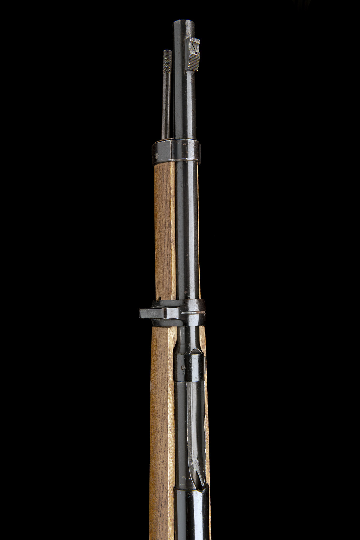 circa 1938, with blued barrel, dove-tailed ramp fore-sight (missing dove-tailed blade), military pattern rear-sight graduated to 12 metres, loading aperture to top of fore-stock, bolt-action cocking, wing safety to end of receiver, walnut three-quarter stock of military style with half-pistol grip (missing top-wood), the whole in imitation of a mini German Mauser K98K service rifle complete with blued steel furniture and an under-barrel clearing rod, much finish remaining