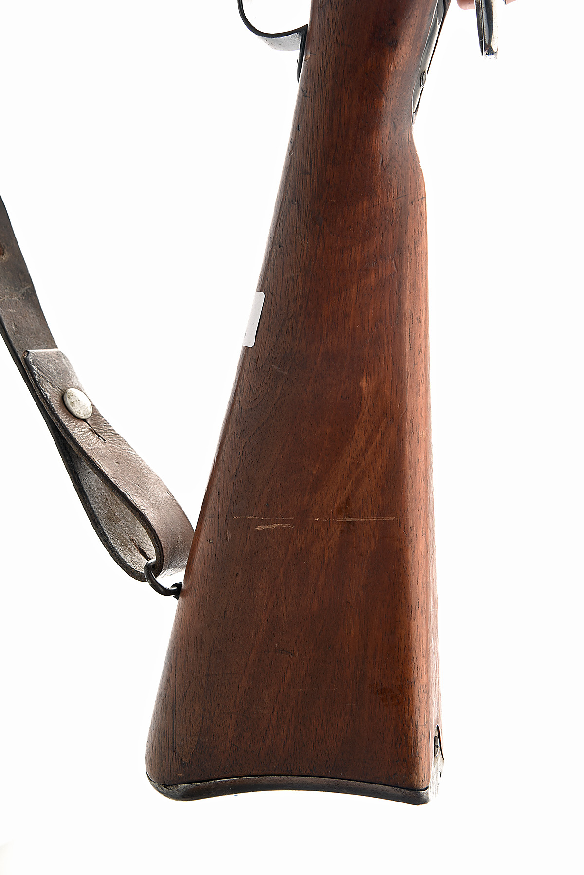 with blued 30 3/4 in barrel, block and blade front-sight and quadrant rear-sight, fluted receiver with toggle-handled straight pull bolt, ring safety to rear and box magazine, regulation iron mounted full walnut stock with two barrel bands, mismatched bolt, (No 65134) complete with original brown leather sling.