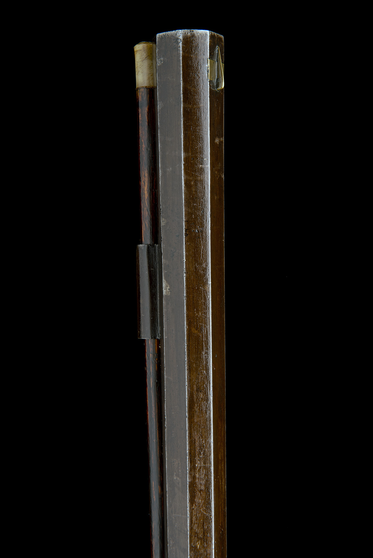 continental circa 1690, with 31 1/2in. swamped octagonal rifled barrel, dove-tailed fore-sight, standing notch rear-sight with two additional folding leaves, auxiliary peep-sight to top of comb, plain borderline engraved lock with internal wheel, carved hammer-spring (possible restoration to hammer), walnut stock cut down to half, the angular butt with mother of pearl and horn inlays, broad iron trigger guard bow with finger-grooves, hogs bristle set trigger and replacement ramrod