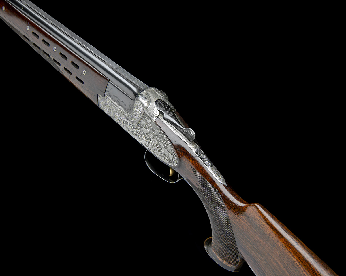 29 5/8in. (76cm) nitro reproved (in 2019) barrels with 9mm ventilated matt rib, bead fore-sight removed and high-vis sight fitted, intermediate bead fore-sight, 2 3/4in. chambers, bored approx. full choke in both, three-piece ventilated fore-end, hold-open toplever, manual safety, hand-detachable lockplates with cocking-indicators, gold-washed single-trigger, bold Germanic scroll engraving on a matted background, the lockplates carved in relief with game scenes of hound and fowl, old silver finish, 14 1/4in. pistolgrip stock including 5/8in. ventilated rubber recoil pad, horn pistolgrip cap, weight 7lb. 15oz.
