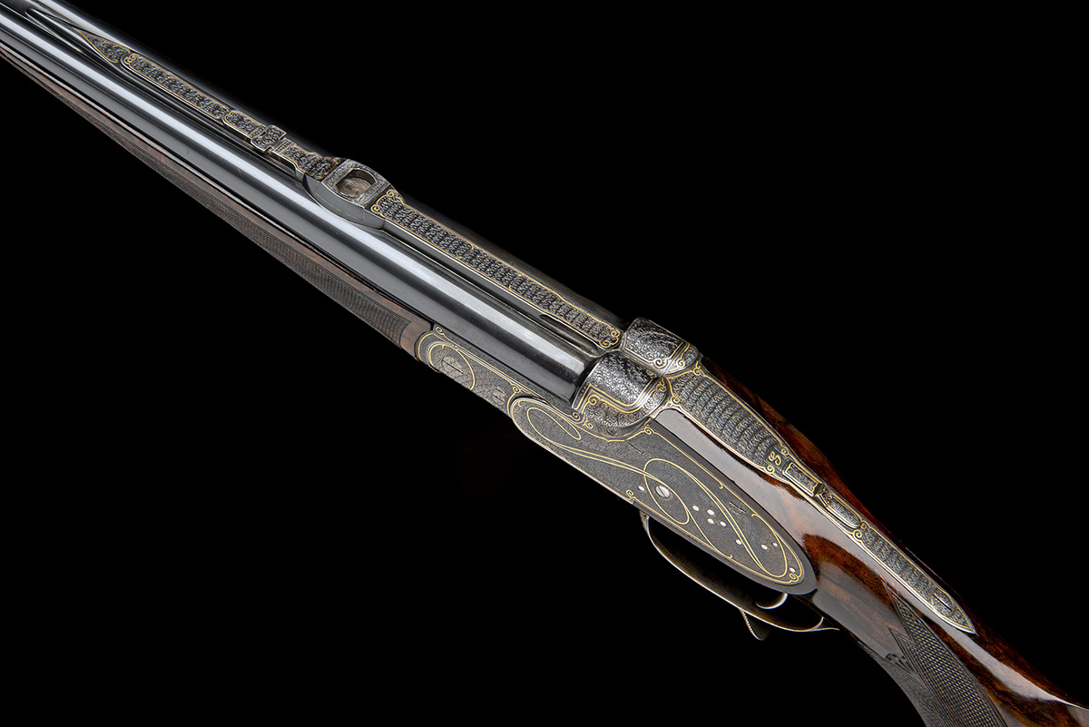 25 7/8in. nitro .375 H&H magnum barrels, raised sight rib fully engraved with fine acanthus scrollwork and with gold line highlights, folding open sights, ramp-mounted blade fore-sight, the breech end with quickly-detachable telescopic sight mount bases;