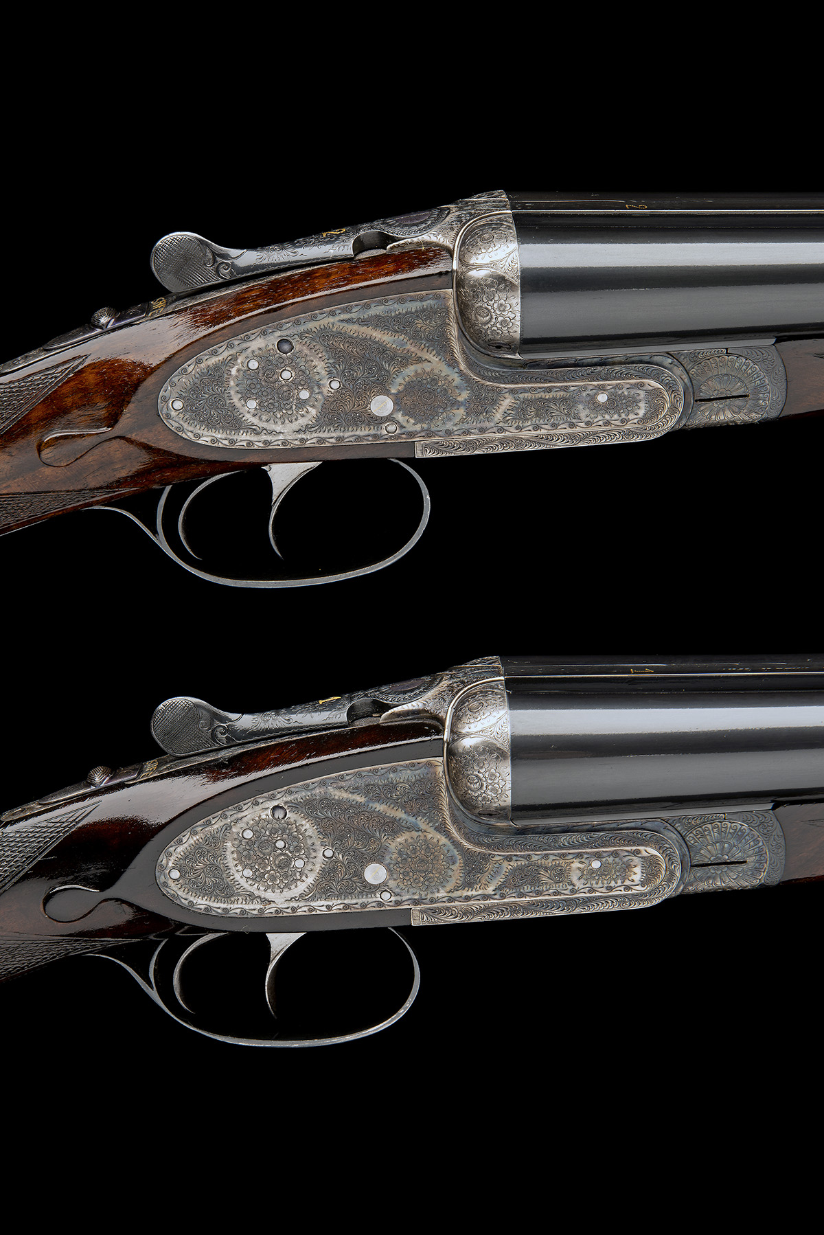 28in. nitro chopperlump barrels, ribs gold-inlaid '1' and '2', 2 3/4in. chambers, bored approx. true cyl. and 1/4 choke, toplevers gold-inlaid '1' and '2', removable striker discs, automatic safeties with gold-inlaid 'SAFE' details, (No.2 safety requires attention, will fire on safe), hand-detachable lockplates, gold-inlaid cocking-indicators, articulated front triggers, rolled-edge triggerguards, fine acanthus scroll engraving with floral bouquets, retaining much original colour-hardening and finish, 14 1/2in. stocks including 7/8in. rubber recoil pads, weight 6lb. 12oz.