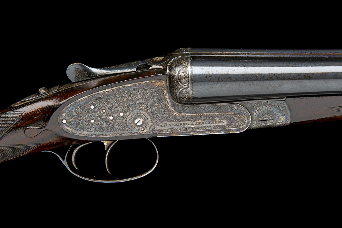 26in. nitro chopperlump barrels, 2 3/4in. chambers, bored approx. imp. cyl. and 1/2 choke, engraved arcaded fences, removable striker discs, automatic safety, hand-detachable lockplates, gold-inlaid cocking-indicators, rolled-edge triggerguard, fully engraved with acanthus scrollwork, retaining much original colour-hardening and finish, 14 3/4in. figured stock, weight 5lb. 14oz.