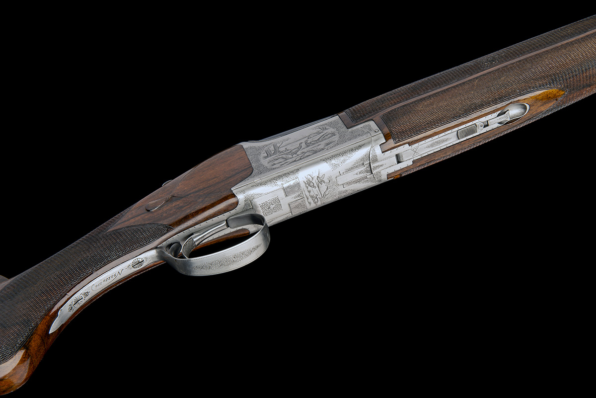 30in. nitro barrels with solid tapered file cut top-rib (likely replacement), 2 3/4in. chambers, bored approx. 1/2 and 3/4 choke, hold-open toplever, manual safety with integral barrel selector switch, sporting trigger, fine acanthus scroll engraving with game scenes of capercaillie, partridge and pheasant, the action signed 'A. CUISSET', bright finish, 14 3/4in. semi-pistolgrip stock, imitation three-piece fore-end wood, weight 7lb. 8oz.