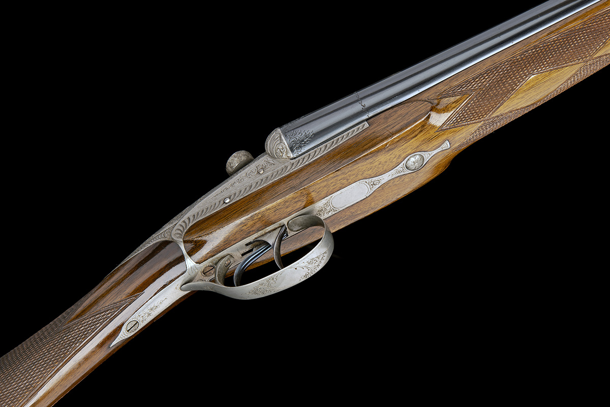 27 5/8in. (70cm) nitro monobloc barrels with sunken matt top rib and no under rib, scroll engraving at the breech end, 7 punch marks, 2 1/2in. chambers, bored approx. 1/4 and 3/4 choke, sprung sliding-breech with converging obturator discs, button barrel release, manual side safety, bouquet and scroll engraving with carved leaf fences, bright finish overall, 14 3/4in. stock including trademarked buttplate, sling swivels, fore-part with horn finial, weight 6lb.