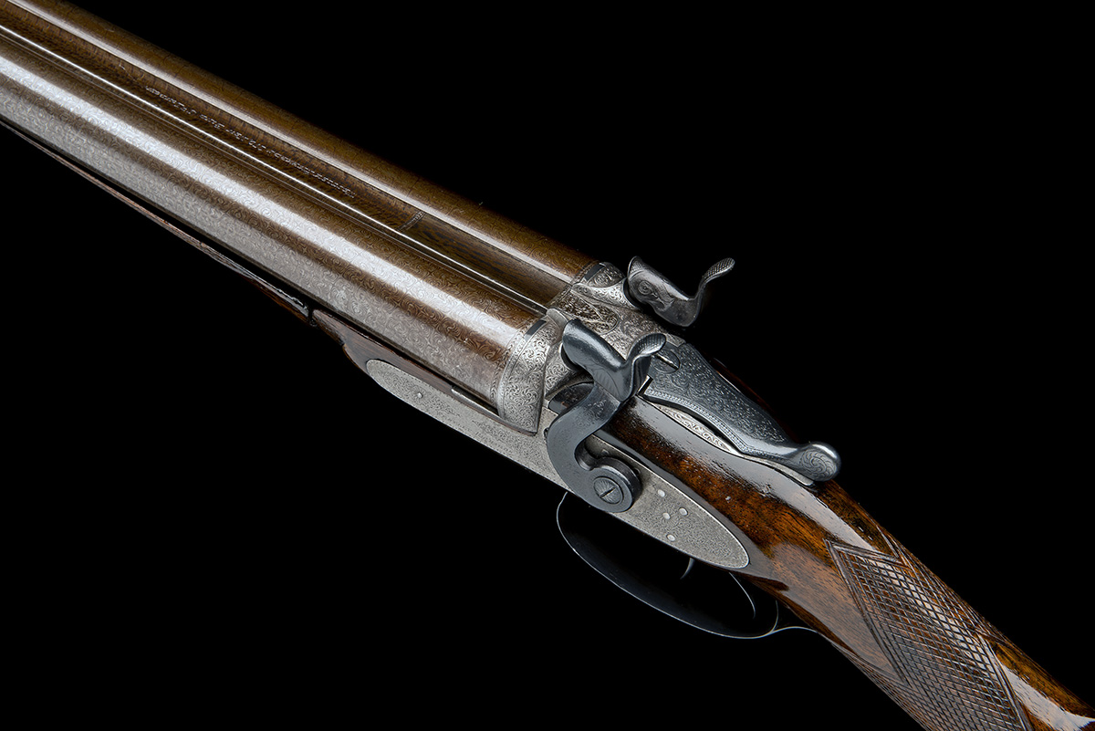 30in. nitro reproved damascus barrels, rib re-engraved 'PATENT. WESTLEY RICHARDS. 170. NEW BOND ST. LONDON.', 2 1/2in. chambers, bored approx. true cyl and 1/2 choke, incorporating Westley Richards improved toplever snap-action, patent no. 1572 of 14th June 1871, use number 2869, carved teardrop fences, rebounding sidelocks with dolphin hammers, removable striker bars, bar-in-wood, the fore-end meeting at the knuckle in a crab joint, fine border and scroll engraving, brushed bright and reblued finish overall, 14 1/4in. well-figured stock including steel buttplate, Deeley and Edge patent fore-end release catch, insert repairs to right overhorn and fore-end wood, weight 6lb. 11oz.