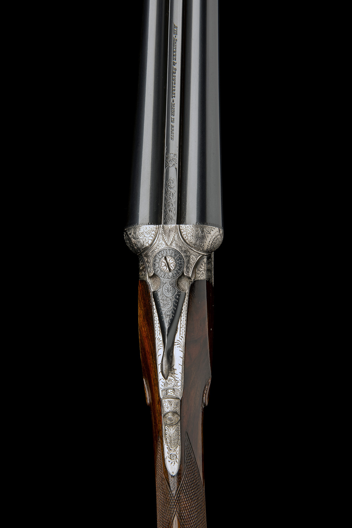 28in. nitro chopperlump barrels, 2 3/4in. chambers, bored approx. true cyl. and 1/2 choke, scroll-back action with removable striker discs, automatic safety, rolled-edge triggerguard, acanthus scroll engraving with floral bouquets, bright finish, 14 5/8in. stock, weight 6lb. 9oz.