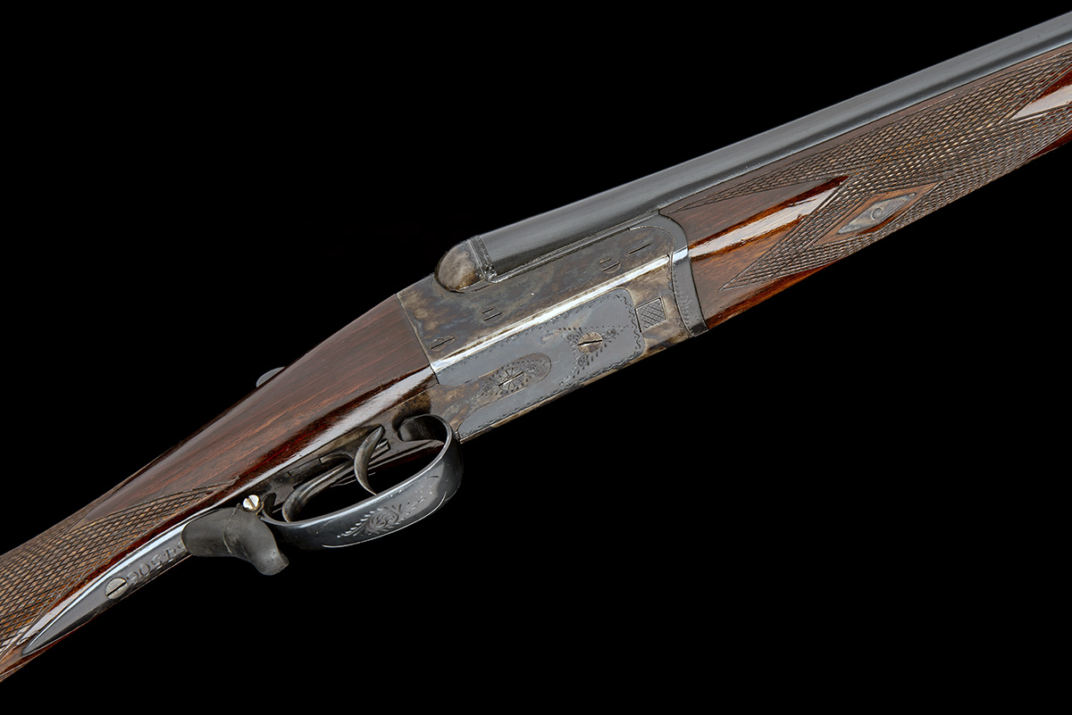 27in. nitro barrels, 2 3/4in. chambers, bored approx. 1/2 and full choke, removable striker discs, automatic safety with gold-inlaid 'S' detail, border engraving, retaining virtually full original colour-hardening and finish, 14 1/2in. stock, weight 5lb. 9oz.