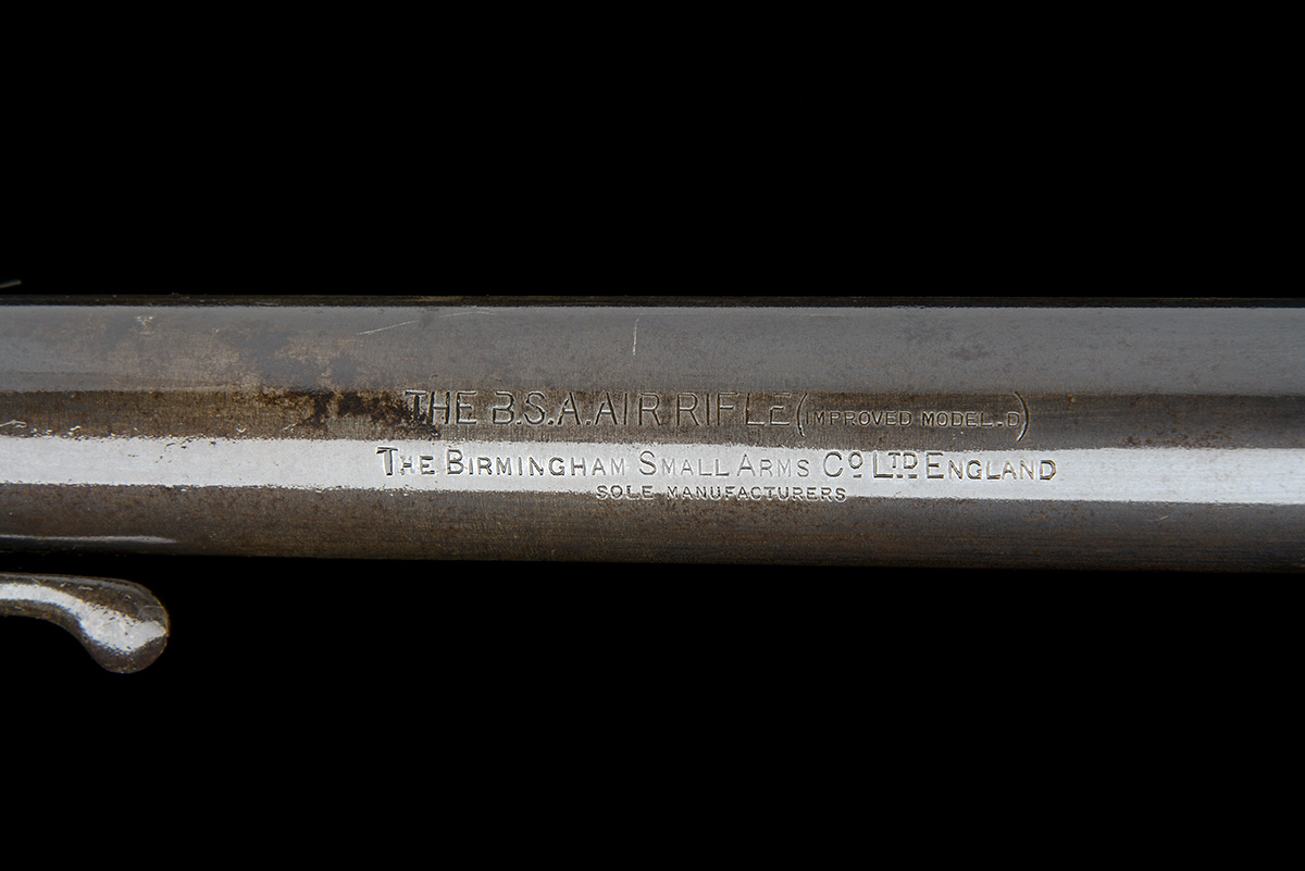 for 1913, with 17in. blued barrel, dove-tailed fore-sight, elevating notch rear-sight, tap load at breech, the top of air-chamber stamped 'THE BSA AIR RIFLE (IMPROVED MODEL 'D'), THE BIRMINGHAM SMALL ARMS CO LTD. ENGLAND, SOLE MANUFACTURERS', double sear trigger block stamped with patent and serial number, chequered walnut saw-handled butt-stock, the top of wrist with factory inlet folding aperture sight, ribbed heel, no provision for fore-end and side-catch under-lever stamped with patent numbers, strong amount of original finish remaining