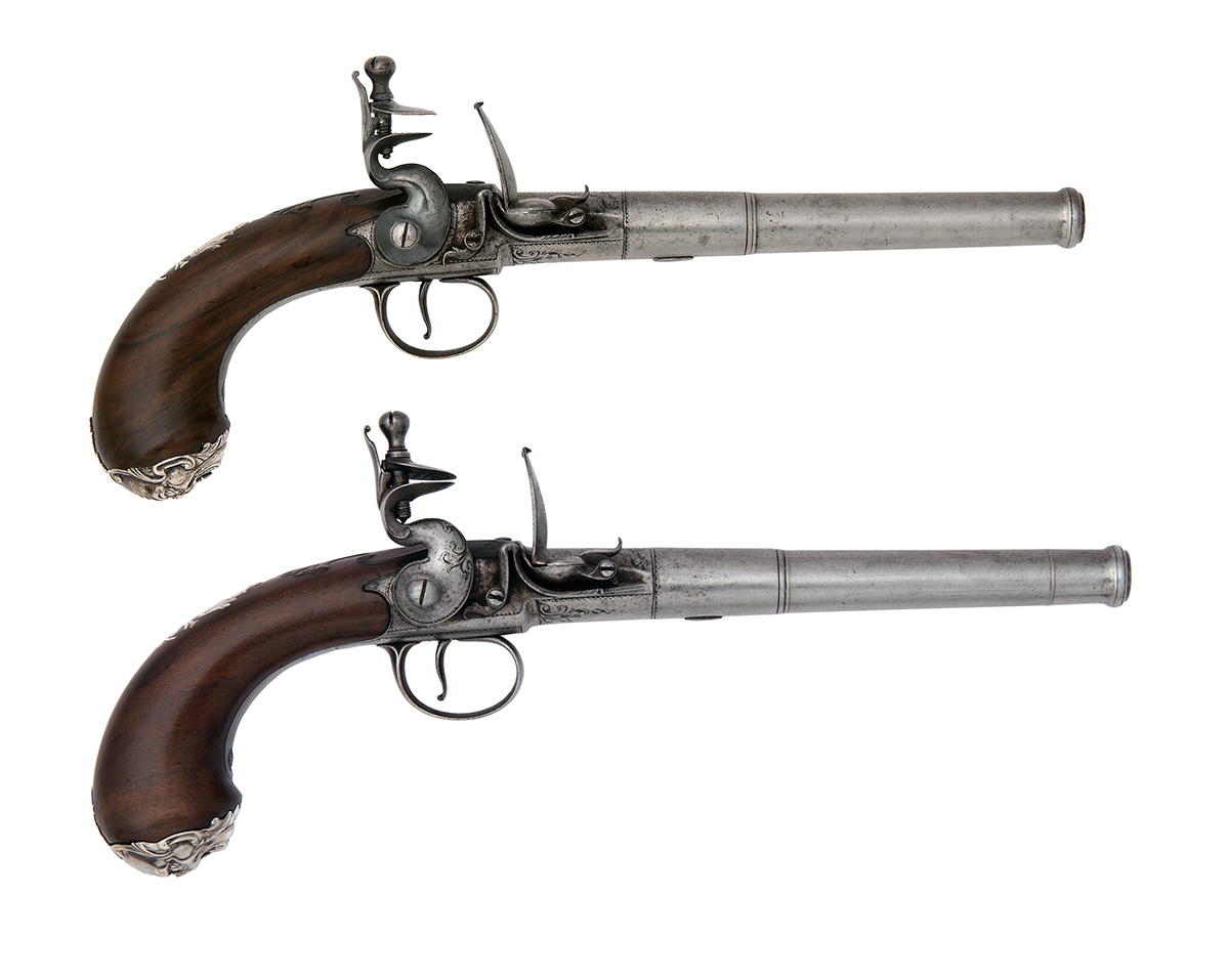 the butt-caps bearing Birmingham hallmarks for 1781, with banded turn-off 5 7/8in. barrels, cannon muzzles (one frozen), engraved breeches signed in a banner 'DAYKIN' (faint, erased on one pistol), makers marks and private proofs to underside of both breeches, rounded actions with recumbent 'L' shaped frizzen springs, smooth bulbous walnut butts with carved aprons around the top-tangs, silver grotesque masks, martial sideplates and escutcheons and trigger-guard bow safes, in a later fitted case lined in burgundy velvet (see notes below)