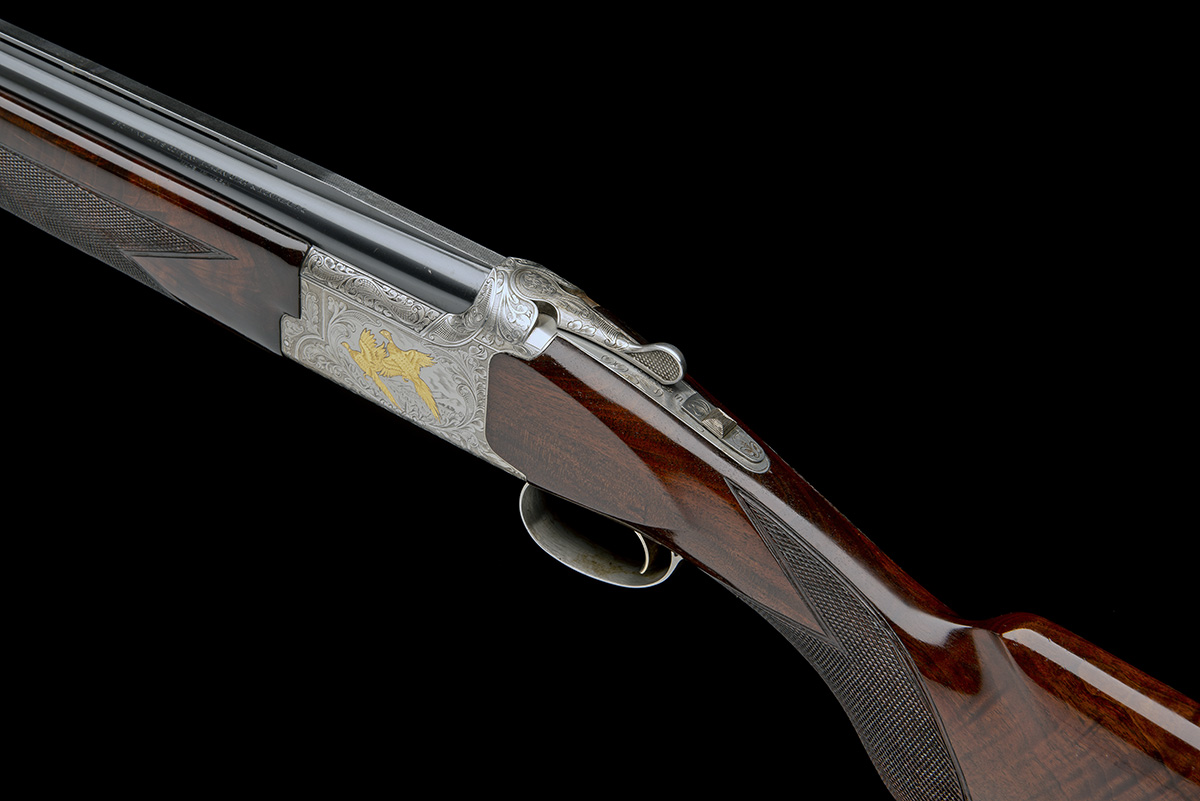 28in. nitro barrels with 8mm ventilated matt top-rib, 2 3/4in. chambers, multichokes (with spares), hold-open toplever, automatic safety with integral barrel selector switch, gold-washed single trigger, bold acanthus scrollwork surrounding gold-inlaid game scenes of pheasant and duck, the underside with a setter, the triggerguard with a partridge, 14 1/4in. figured semi-pistolgrip stock including 1in. ventilated rubber recoil pad, weight 8lb. 11oz., in its universal case