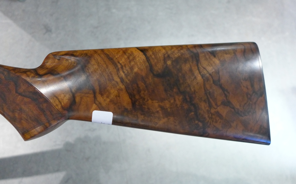 29 1/2in. nitro barrels with solid raised matt top-ribs (No.1 missing bead sight), gold-inlaid '1' and '2' at the breech ends, 2 3/4in. chambers, bored approx. true cyl. and 1/4 choke, hold-open toplevers gold-inlaid with a crown, manual safeties (No.2 requires attention), fine acanthus scroll engraving surrounding game scene vignettes of pheasant and English partridge in flight, the undersides with lone woodcocks, the triggerplates engraved 'L. SABATTI' (No.1) and 'INC Venzi' (No.2), bright finish, 15 1/8in. highly-figured pistolgrip stocks, weight 6lb. 2oz. and 6lb. 4oz., in their lightweight leather motor case