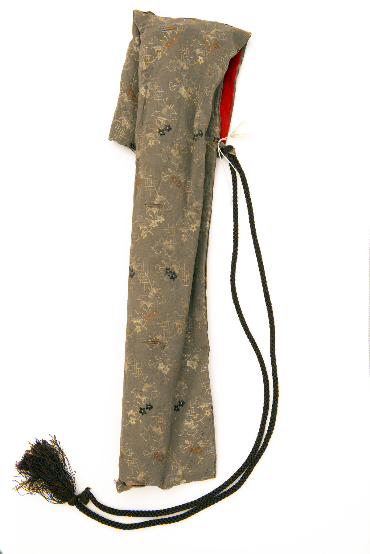 late 18th to early 19th century, blade of 9 1/2in. with straight 'hamon' encompassing the 'kissaki', short signed tang with single 'mekugi-ana', the whole mounted in a quality 'shira-saya' and housed in a period silk bag
