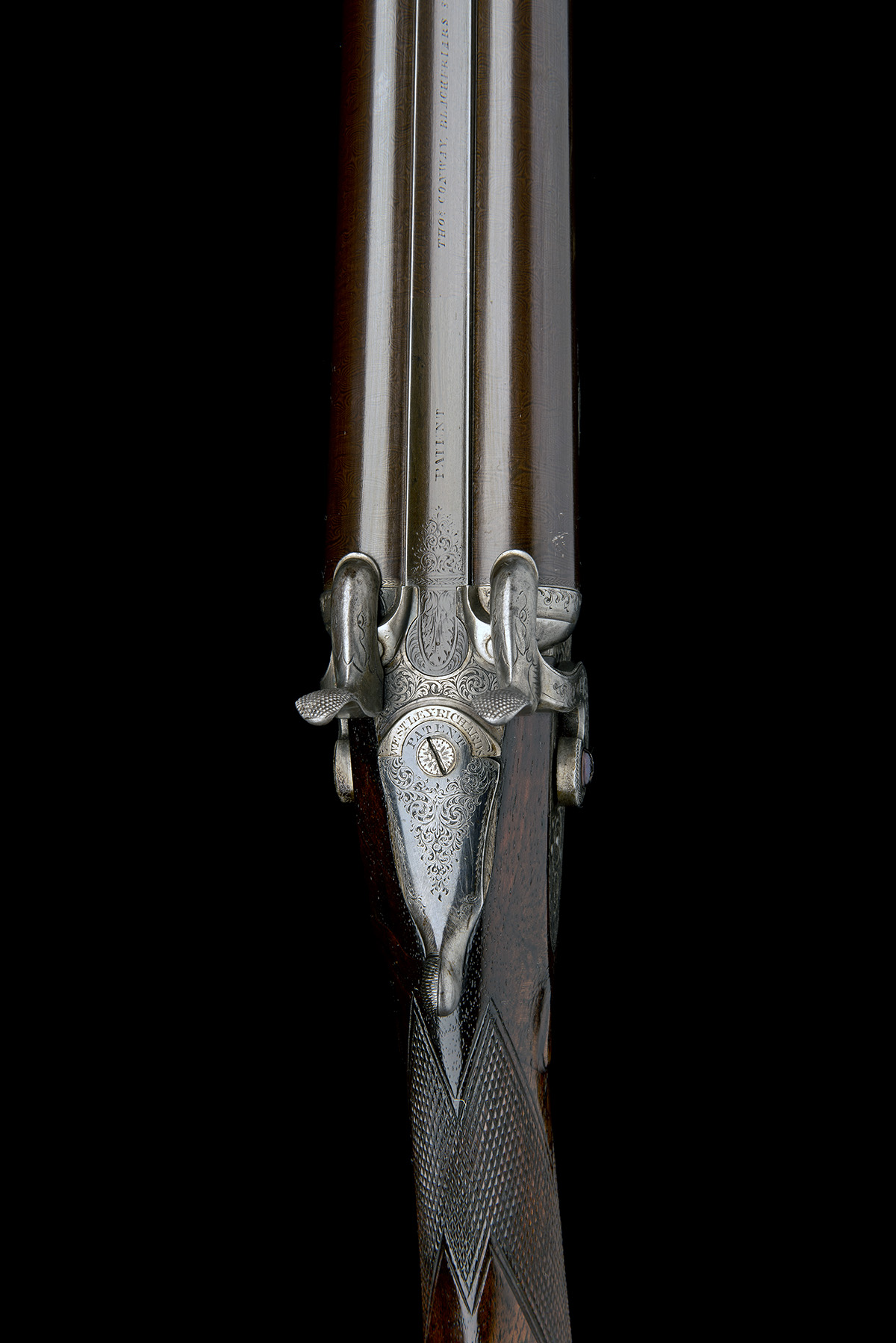 30in. nitro reproved damascus barrels, the rib engraved 'PATENT. THOs. CONWAY. BLACKFRIARS ST. MANCHESTER.', 2 1/2in. chambers, bored approx. true cyl. in both, incorporating Westley Richards improved toplever snap-action, patent no. 1572 of 14th June 1871, use number 127, non-rebounding locks with dolphin hammers, bar-in-wood, the fore-end meeting at the knuckle in a crab joint, border and partial acanthus scroll engraving, brushed finish (hammer retaining screws reblued), 14 1/4in. stock with steel heel and toe plates, weight 6lb. 10oz., together with a green Napier slip
