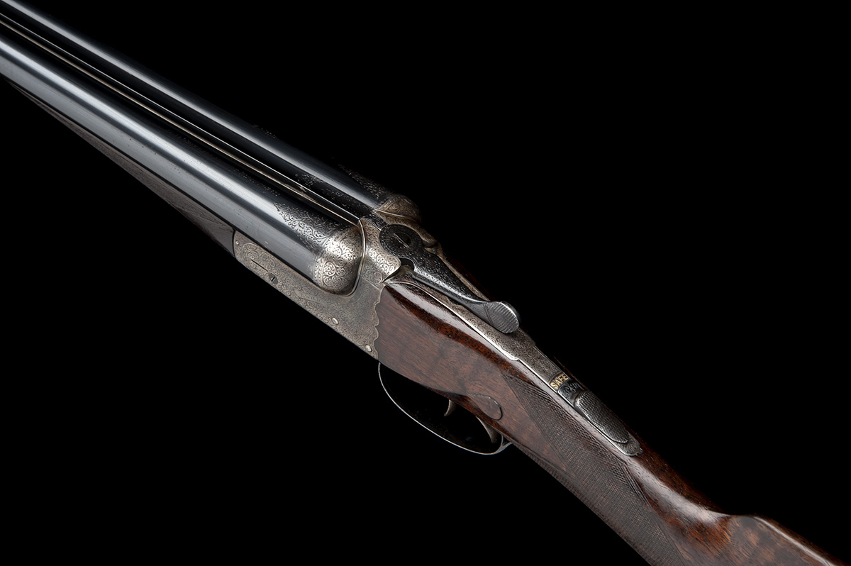 27in. nitro barrels, the tubes engraved 'T. WILD. 17-18 WHITTALL STREET. BIRMINGHAM.' and with a flash of acanthus scrollwork at the breech ends, 2 1/2in. chambers, bored approx. 1/4 and full choke, scroll-back treble-grip action, automatic safety with gold-inlaid 'SAFE' detail, border and tight acanthus scroll engraving, retaining some original colour-hardening and finish, 13 3/4in. stock, weight 6lb. 7oz.