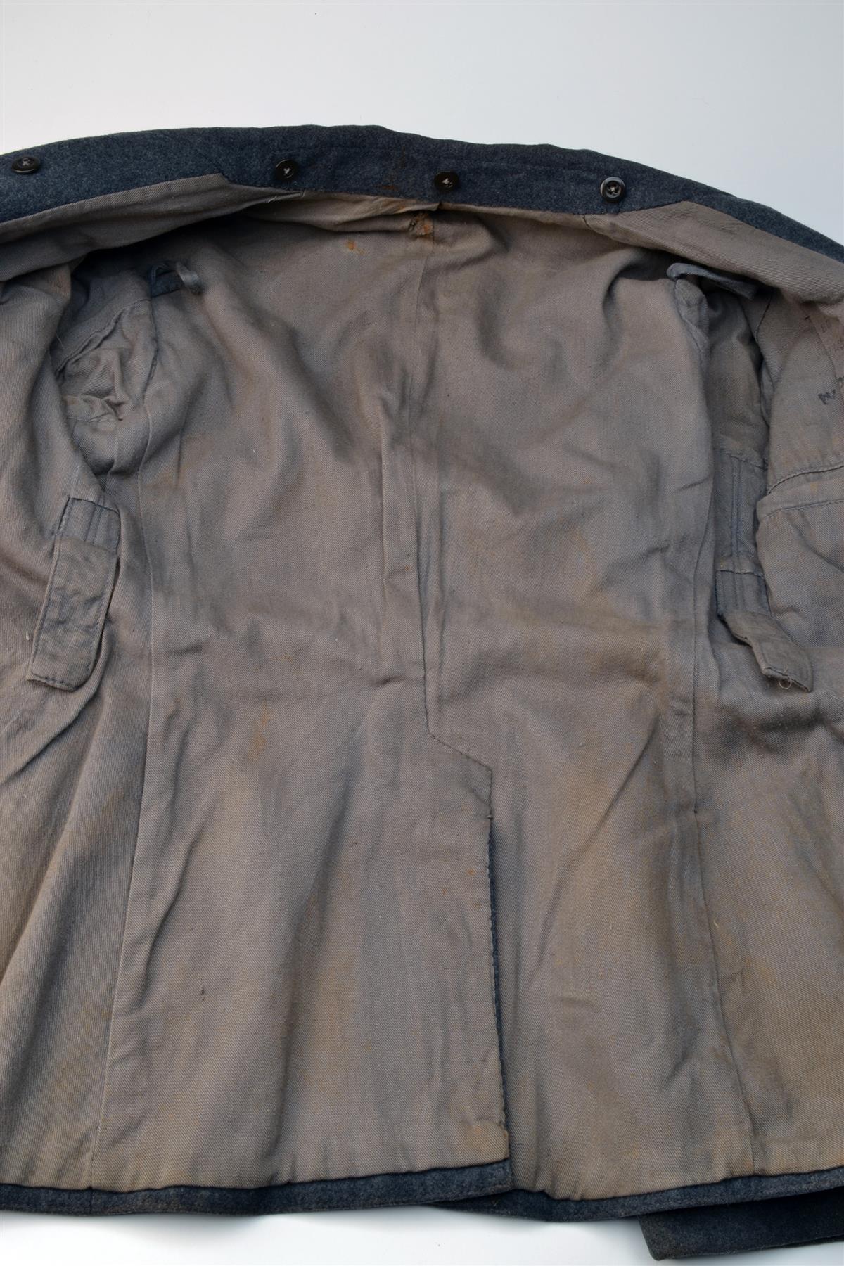 the tunic with ink-stamped makers mark and owners name (both partly obscured), yellow piped collar and shoulder-boards, yellow collar patches with four winged insignia and black leather belt fitted with a steel buckle with central embossed Luftwaffe eagle device (generally very good with one hole to lining and one moth hole to right hand lower pocket and left hand cuff)
