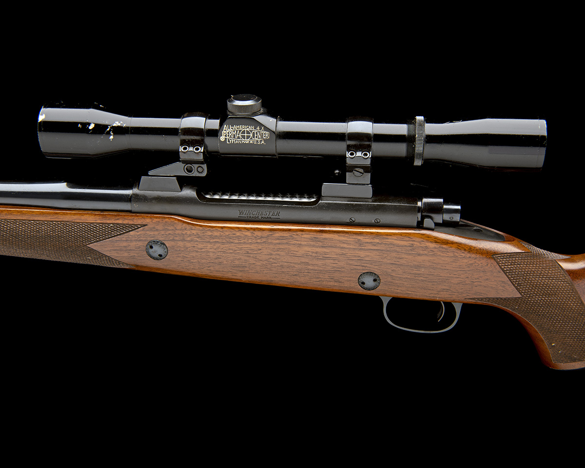 22in. nitro barrel with open sights and ramp-mounted bead fore-sight, the receiver mounted with a Lyman 'All-American 4x Perma Center' telescopic sight in quickly-detachable mounts, floral engraved recoil blocks, hinged floorplate, pistolgrip stock with cheekpiece and monte carlo comb, Winchester pistolgrip-cap, sling swivels, 13 3/8in. pull including 7/8in. rubber recoil pad, weight 8lb. 10oz. (unscoped) and 9lb. 10oz. (with scope)