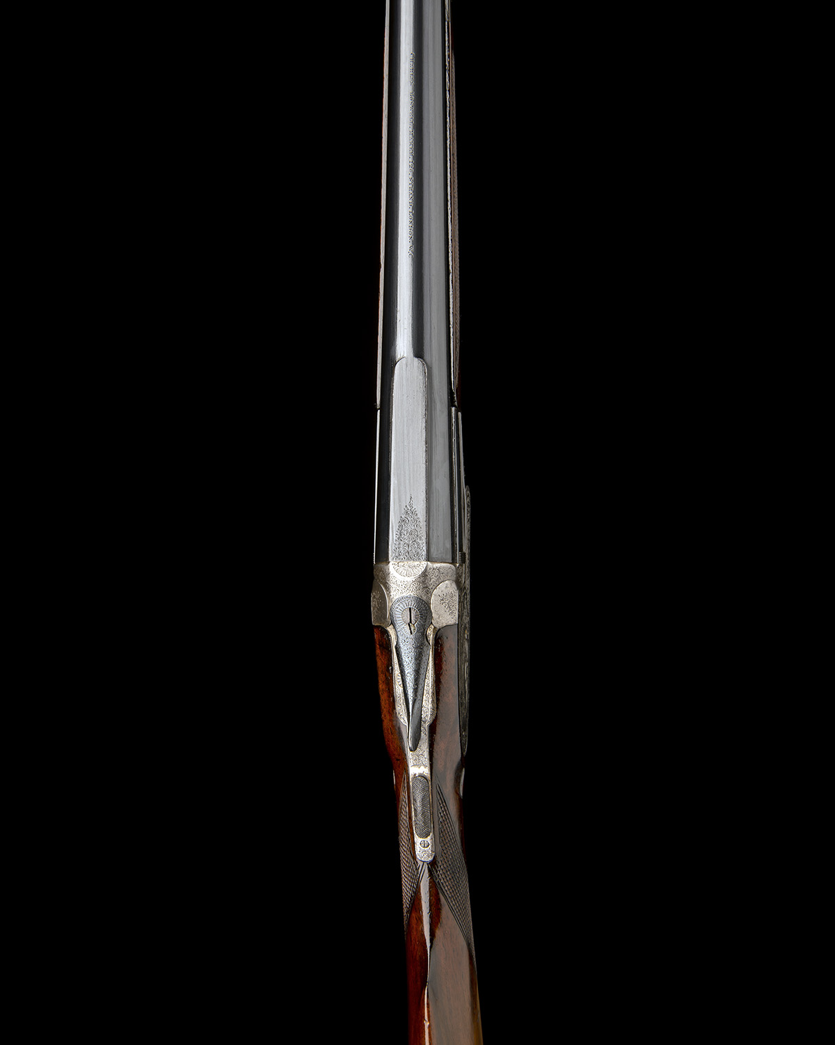 30in. nitro reproved blacked damascus barrel engraved 'CHARLES BOSWELL. MAKER. 126. STRAND. LONDON. W.C.', the breech end with short sight flat with acanthus scroll detailing, 2 3/4in. chamber, bored approx. full choke, bore dimension marginal, carved fences, automatic safety with gold-inlaid 'SAFE' detail, gold-inlaid cocking-indicator, slight movement to extractor lifter, the action, lockplate and furniture with fine acanthus scroll engraving, a single floral bouquet and beaded bordering, the lockplate with a finely engraved game scene of two dogs on point, the triggerguard with a further hound, the left side of the action body with two pheasants, 14 1/4in. stock including 1in. rubber recoil pad, fore-end with Anson push rod release and sculpted horn finial, weight 6lb. 7oz.