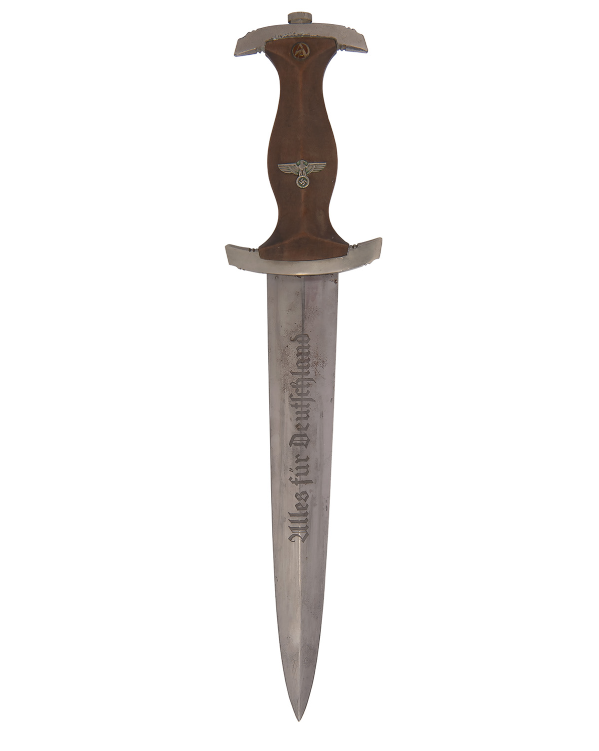 pre-war manufacture, with double-edged 8 1/2in. blade etched 'ALLES FUR DEUTSCHLAND' and with the makers mark to reverse, solid nickel furniture, the lower guard marked 'Wm' for the 'Westmark' region, shaped grip with inlet insignia (some mild bruising) and complete with its brown anodised metal scabbard with nickel fittings and attached leather belt hanger (some spotting to scabbard finish), scarce maker