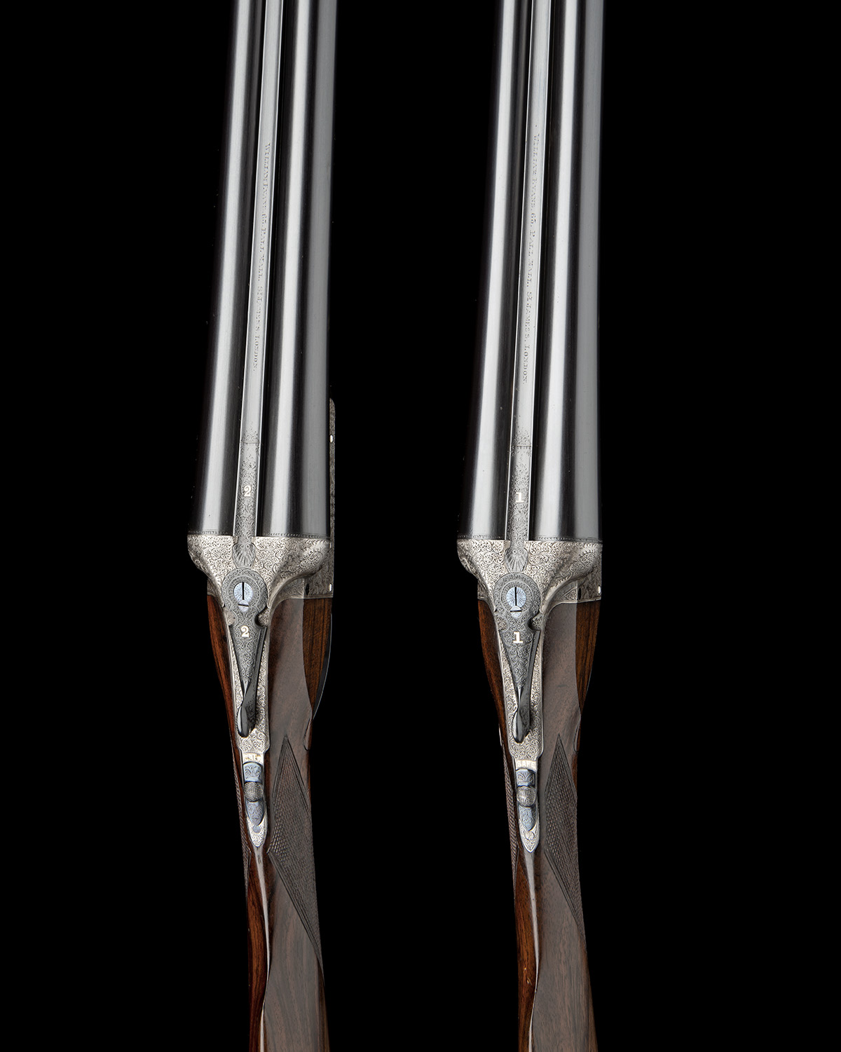 28in. nitro barrels, ribs engraved 'WILLIAM EVANS. 63. PALL MALL. ST. JAMES'S. LONDON.' and gold-inlaid '1' and '2' at the breech ends, 2 1/2in. chambers, bored approx. imp. cyl. and 1/4 choke, treble-grip actions with removable striker discs, toplevers gold-inlaid '1' and '2', automatic safeties with gold-inlaid 'SAFE' details, intercepting sears, fine acanthus scroll engraving with floral bouquets, retaining very slight traces of original colour-hardening and some renewed finish, 14 1/4in. well-figured stocks, bolstered fore-end woods, weight 6lb. 4oz.
