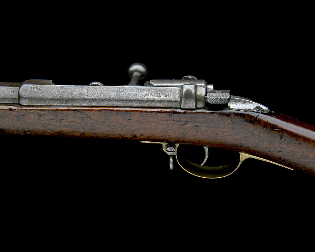 dated for 1875, with 33 1/2in. barrel, block and blade fore-sight, broad elevating ladder rear-sight with windage adjustment and auxiliary folding battle-sight, octagonal breech-section signed 'DANZIG' and with a 'W' over a crown, octagonal receiver marked 'J.G. M71', straight handled bolt (matching number) with chequered flag safe to rear, walnut full-stock with Imperial inspectors stamps to side and underside of butt, iron furniture, the spur of the heel-plate stamped '6.R.9 17', brass trigger-guard with iron trigger-plate, two barrel bands and nose-cap and jag-ended iron clearing-rod, all matching numbers.