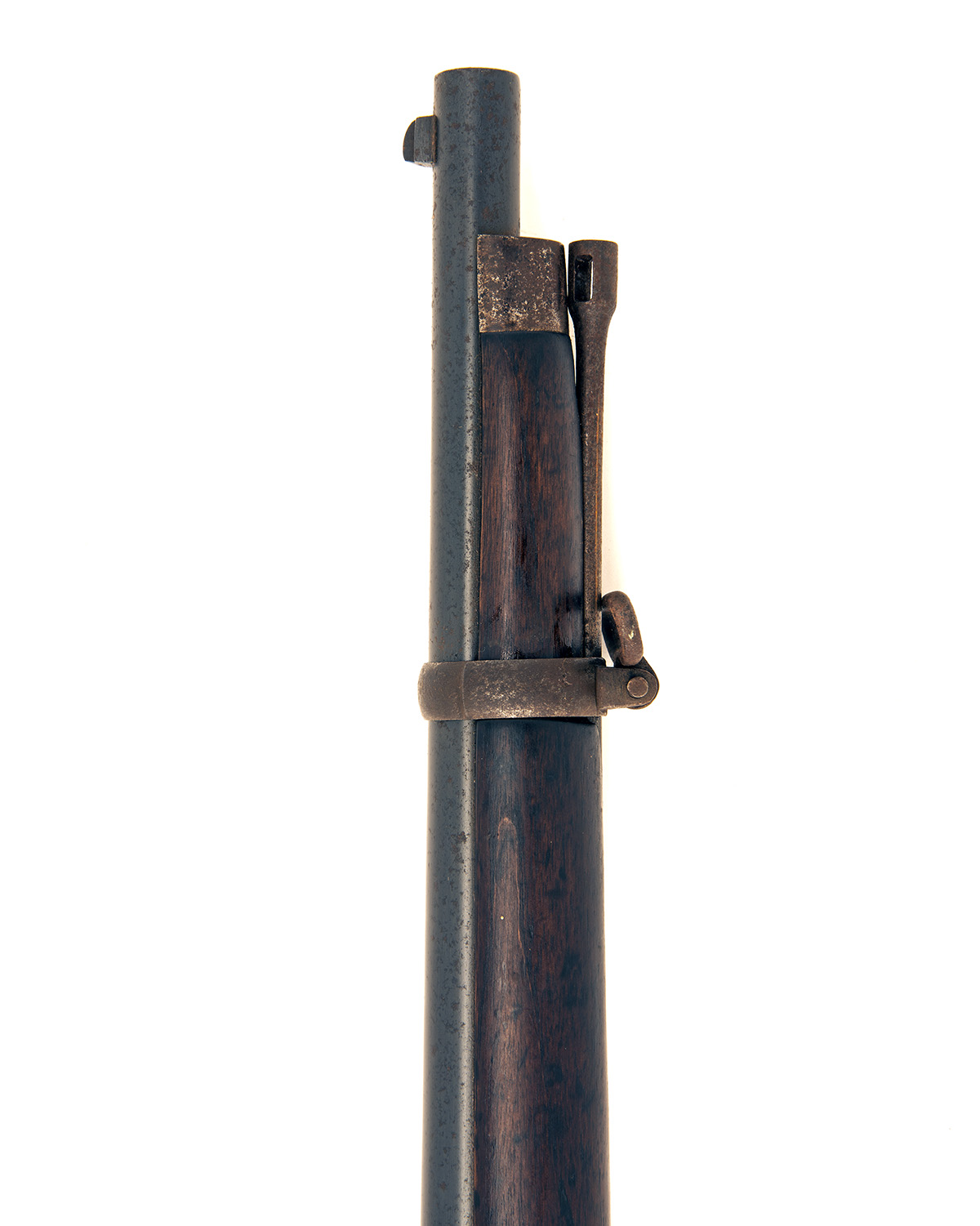 dated for 1869, with 20 1/2in. reblued barrel, block and blade fore-sight, ladder rear-sight graduated to 900 yds., the rear of breech inscribed 'TERRY'S PATENT 30 BORE', side-mounted lift and twist bolt, plain bar-action lock signed 'CALISHER & TERRY' together with the date and a Victoria crown further stamped at tail, walnut full-stock with iron furniture, single key and barrel-band and complete with iron clearing rod, some shallow pitting below finish