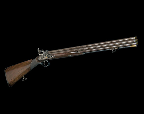 circa 1800, with hexagonal 20 1/4in. rifled damascus barrel cluster comprising of six barrels around a seventh central barrel, all discharging simultaneously, the concave top-rib signed 'H. NOCK LONDON' (refreshed), small white-metal fore-sight and a standing notch rear-sight applied to the scroll engraved top-tang, triple ported platinum lined vent, re-coloured bevel-edged lock signed on the tail 'H. NOCK', sliding safe forwards of the hammer, re-coloured pan, roller frizzen and hammer, walnut half-stock chequered at the wrist (damage at head), applied padded leather cheek-piece, re-blued iron furniture including heel-plate, the top-spur engraved with a hunting dog, scroll engraved roll-edged trigger-guard bow and equipped with a replacement horn-mounted under-barrel ramrod