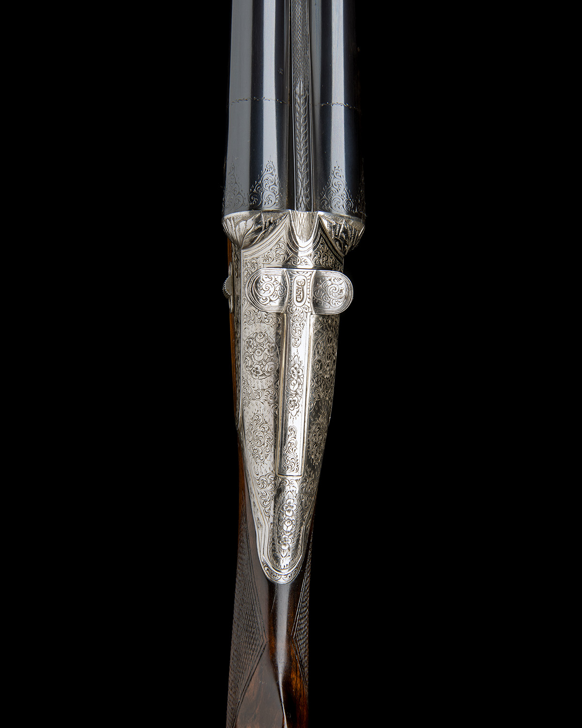 27 5/8in. (70cm) nitro monobloc barrels with sunken matt rib and no bottom rib, replacement plastic bead fore-sight, triple proof with ten punch marks, acanthus scroll detailing at the breech ends, 2 3/4in. chambers, bored approx. 1/4 and 1/2 choke, sprung sliding-breech with converging obturator discs, carved leaf fences, engraved button barrel release, manual side safety with 'F' and 'S' details, engraved in relief with acanthus scrolls and floral bouquets, bright finish overall, 14in. stock with sling swivels, including 5/8in. ventilated rubber recoil pad, fore-end with horn finial, weight 6lb. 1oz.