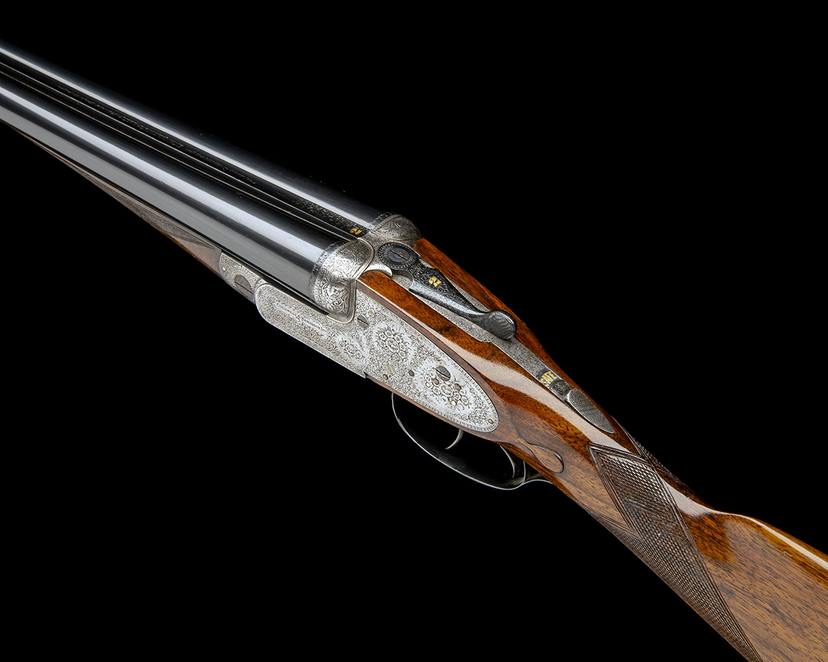 30in. nitro barrels, the rib engraved 'COGSWELL & HARRISON LTD. "EXTRA QUALITY VICTOR EJECTOR" 141. NEW BOND ST. LONDON.', and gold-inlaid '2' at the breech end, 2 1/2in. chambers, bored approx. true cyl. and 1/4 choke, toplever gold-inlaid '2', automatic safety with gold-inlaid 'SAFE' detail, gold-inlaid cocking-indicators, fine acanthus scroll engraving with floral bouquets and some beaded bordering, brushed bright and reblued finish overall, 14 7/8in. figured stock including 7/8in. rubber recoil pad, weight 7lb., in a leather case